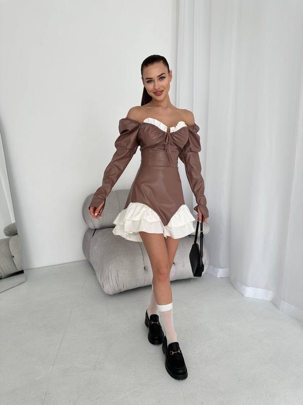 BESTSELLER 😍 наша нова провокаційна і неймовірно круто сидяча по фігурі сукня з еко шкіри, забезпечить вам кохання з першої примірки 🔞😮 На спинці стрічка, рукава з резинкою, тому можна регулювати. Манжети з розрізом, а з переду шнурочок для регулювання декольте 🥰 Ціна 1049 грн ▪️Модель 494 ▪️Розмір: 40-42, 42-44, 44-46 ▪️Колір: чорний, карамель ▪️Тканина: еко шкіра + плотний Коттон