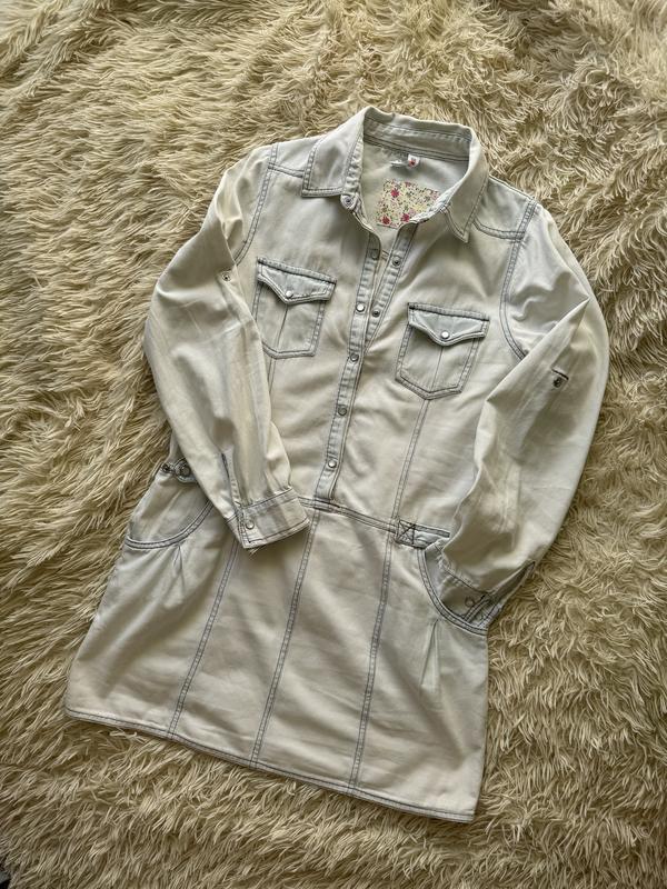 Джинсова сукня вільного крою. Джинси мʼякий, приємний до тіла. Рукав можна завертати і фіксувати на лямки. Дефекти не значні вкінці на фото. В ціну врахувала. Мій зріст 172
