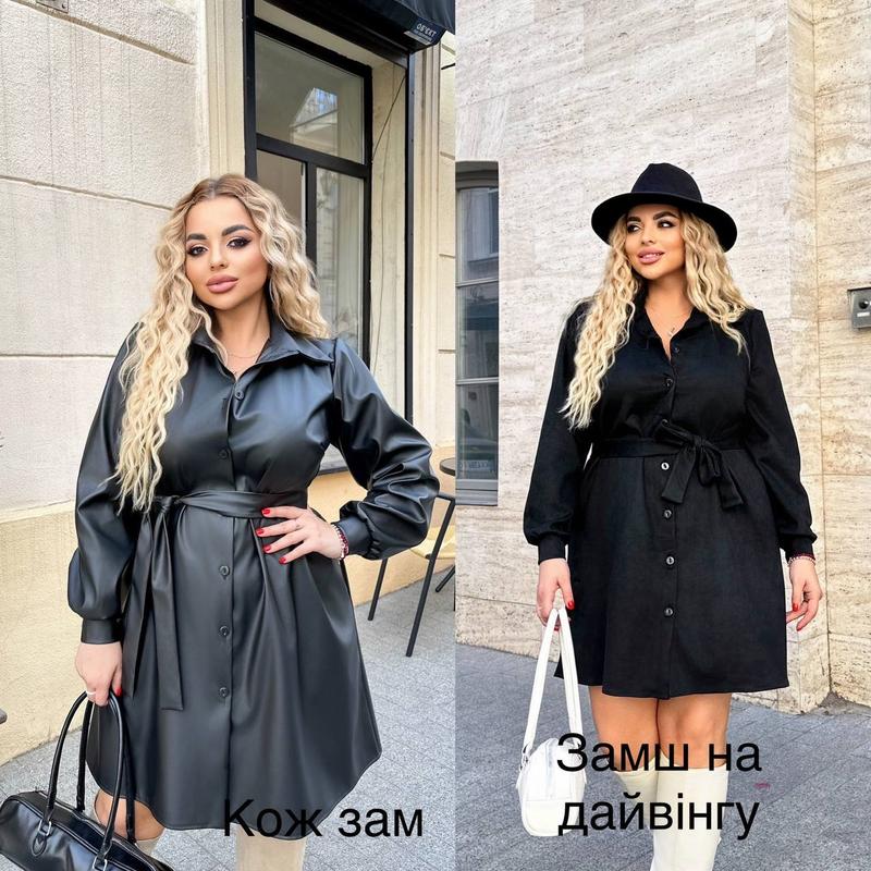 Чорна Стильна сукня #1403 Розміри 48-52,54-58,60-64 Тканина✅стрейчева матова Кожа на трикотажній основі, та замш на дайвінгу, тягнеться до 5 см Опис: йде оверсайс, сукню можна носити як тренч(плащ) йде з карманами, та ремінцем Заміри👉 48-52 54-58. 60-64 Ог. 120 130. 140 От 125. 135. 145 Об 132. 142. 155 Дов. 96. 97. 98 Д.рук. 64 65. 66 На моделі 48-52, зріст 167 см Параметри Ог 112 от 85 об 16