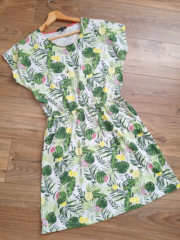 Чудова літня сукня з фруктовим принтом, у прекрасному стані, розмір М. Приємна до тіла, влітку не парить, тканина натуральна:бавовна та еластан.Чудово тягнеться, має кишені та резинку на талії.