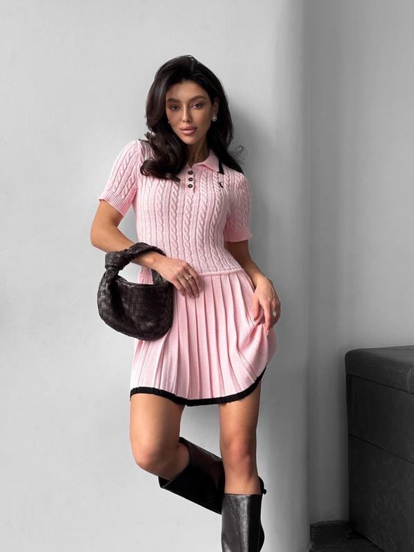 Стильна та жіночна в’язана сукня.🤍Верх виконаний у вигляді трикотажного поло з плетеним візерунком та короткими рукавами, що додає вишуканості та елегантності. Застібка на ґудзики на комірці надає виробу особливого шарму. Спідниця плісирована, що додає легкості та динамічності образу. Контрастна чорна окантовка по низу спідниці надає вишуканості та завершеності стилю. Ідеальний варіант як для повсякденного носіння, так і для особливих випадків. Розмір оверсайз