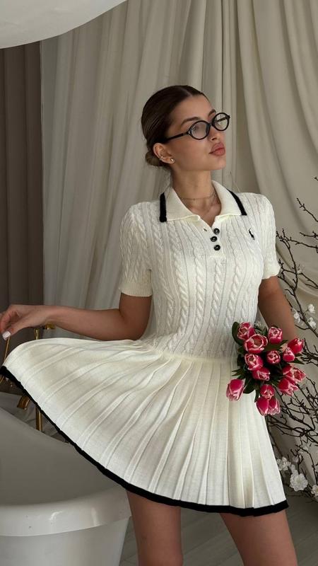 Стильна та жіночна в’язана сукня.🤍Верх виконаний у вигляді трикотажного поло з плетеним візерунком та короткими рукавами, що додає вишуканості та елегантності. Застібка на ґудзики на комірці надає виробу особливого шарму. Спідниця плісирована, що додає легкості та динамічності образу. Контрастна чорна окантовка по низу спідниці надає вишуканості та завершеності стилю. Ідеальний варіант як для повсякденного носіння, так і для особливих випадків. Розмір оверсайз