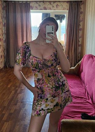 Квіткова сукня від H&M рукава-ліхтарики,модна носити як на плечах так і спустити нижче ,має шнурівку на грудях та підкладку, позаду на спині утягуюча резинка Підійде на розмір S-M Річ продаю бо на мене мала та коротка Мої параметри: Об'єм грудей 95 Об'єм талії 75 Об'єм стегон 105 Зріст 179