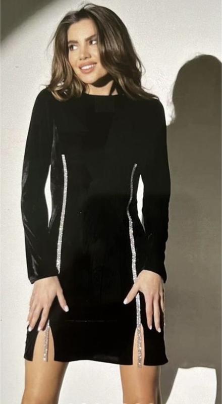Колір - чорний Тканина - бархат. Сукня з двома розрізами на ніжках та на рукавах ( розрізи по 13см). Країна виробник Україна Заміри : Обʼєм грудей 92см, обʼєм стегон 94см, довжина по спинці 87см, довжина рукава 62см.