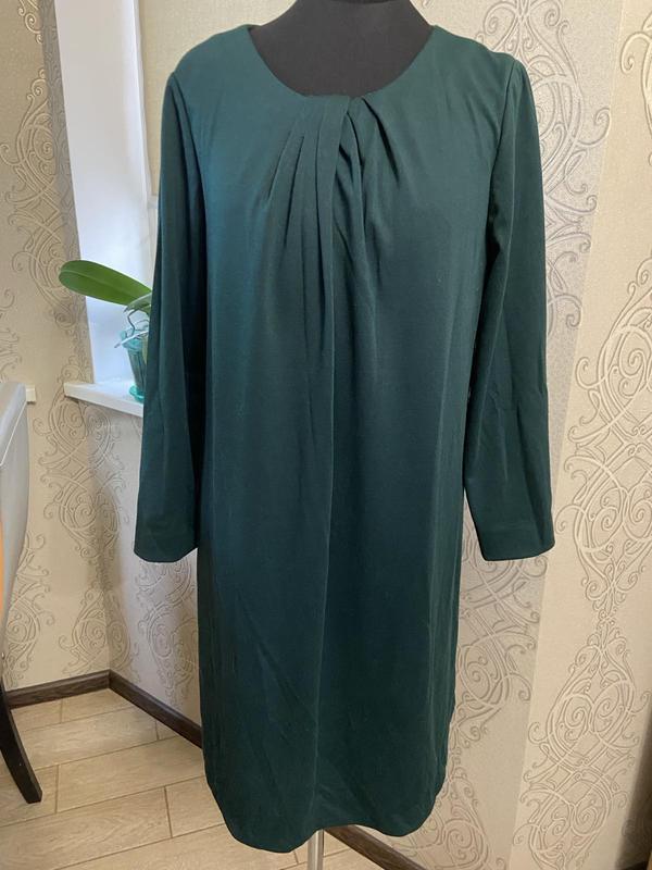 Трикотажна сукня гарного зеленого кольору з підкладкою. Тканина досить цупка, тримає форму. По спинці довга змійка. Заміри : довжина по спинці -88см, довжина рукава -58см, пог-53см, низ-58см, в талії вільна.