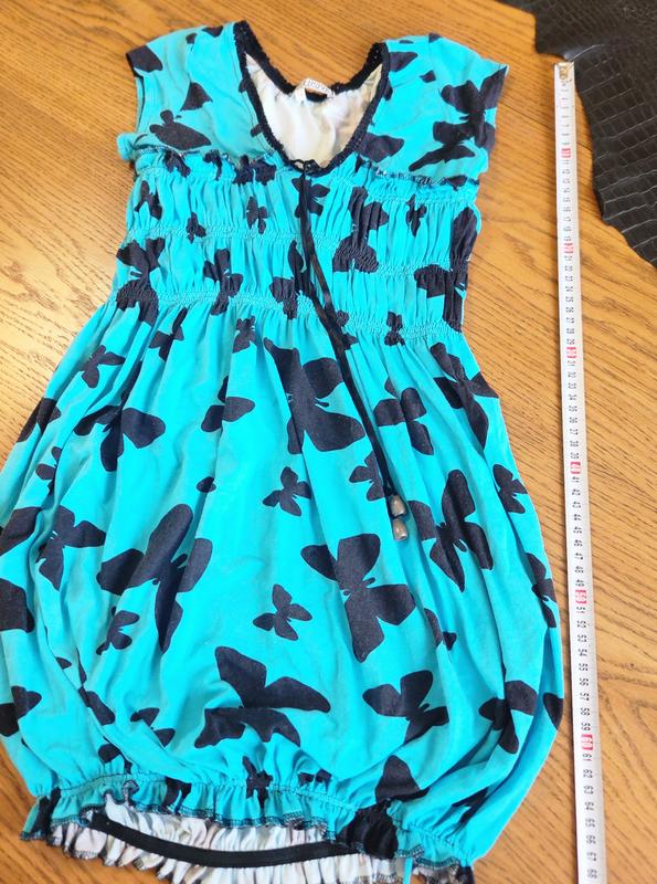 Продам плаття в в красиві метелики насиченого кольору типу дзвіночка на резинці внизу. Стан гарний , тканина якісна, один недолік трішки місцями покошлатино, на останньму фото вказала, решта без дефектів. Пишіть домовимся.