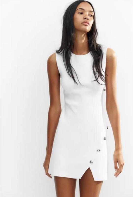 Сукня без рукавів з круглим коміром. Декоративні асиметричні металеві ґудзики на низу. БІЛИЙ | 9598/074/250