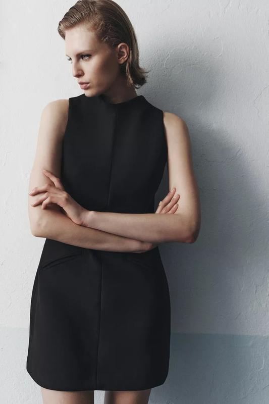 XS,S,M,L Короткое платье с круглым воротником и без рукавов. Имеет имитацию карманов спереди и скрытую молнию сзади.