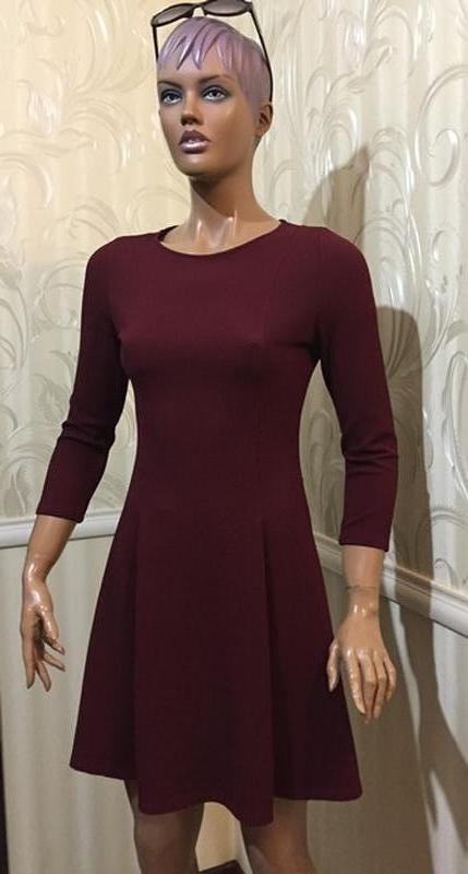 Платье цвета марсала, оригинального кроя, облегающим верхом и свободной юбкой с боковыми складками впереди и сзади, рукав 3/4. Бренд PULL&BEAR. Бирка с составом изделия срезана. По составу: полиэстер, эластан. Ткань фактурная, тянется. Размер по бирке на изделии L, можно рассматривать М (см.замеры). Состояние идеальное. малозаметный нюанс: у горловины чуть нарушена строчка (фото №5). Замеры: плечи - 34/36 см., ПОГ - 42/47 см., ПОТ - 35/40 см., ПОБ - 50/52 см., длина от плеча - 87 см., длина рукава: внешняя - 49 см., внутренняя - 35 см. Ткань эластичная, тянется. Размер манекена S. Добро пожаловать в мой магазин. Известные бренды, отличное качество - доступные цены.