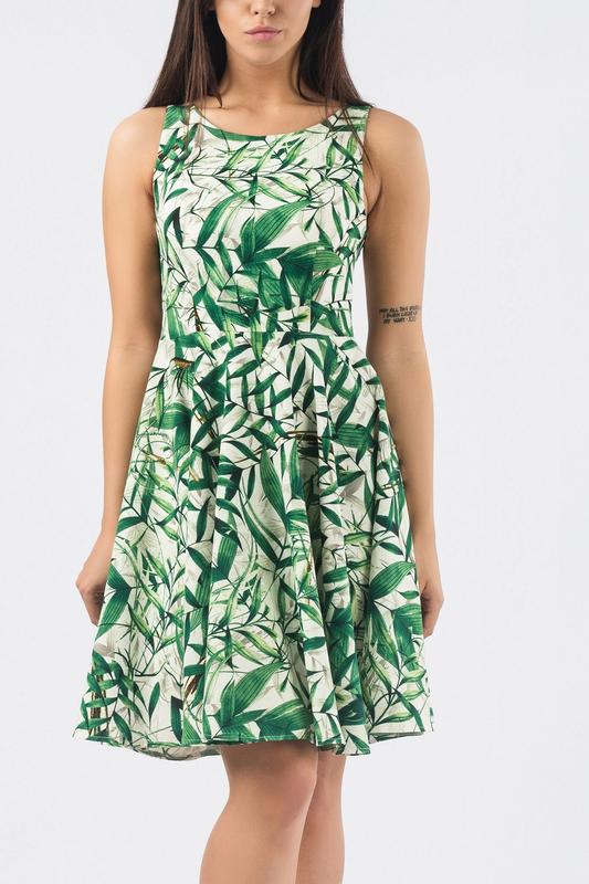Сукня для літнього сезону із приємної тканини. Модель міні довжини. Верх має округлий виріз. Відрізна спідниця по лінії талії. На світлому фоні принт зеленого листя. Сукня додасть своїй володарці свіжості та елегантності.