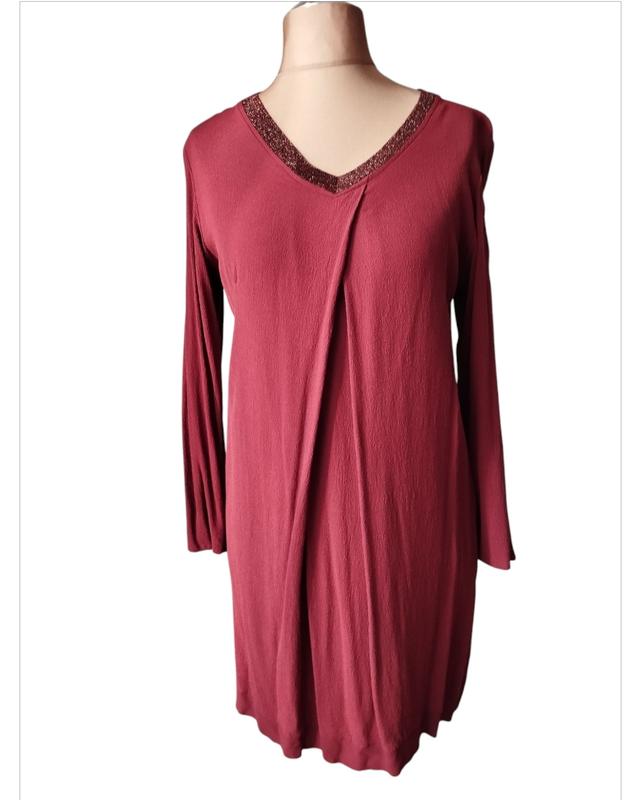 Изящное платье красивого оттенка марсала с интересными деталями. Изготовлена из нарядной фактурной вискозы (100%).. Покрой подойдет для любого типа фигуры, спереди углубленная сборка, фасон свободный. По низу пришита планка из шифона в тон. V подобный вырез горловины обработан эластичной тесьмой с люрексовой нитью. Для твого романтичного образу! Изготовлена в Италии. Замеры: полу обхват груди - 53 см (есть эластичность по ширине) длина рукава - 53 см длина по спинке - 81 см по линии талии и бедер - свободно