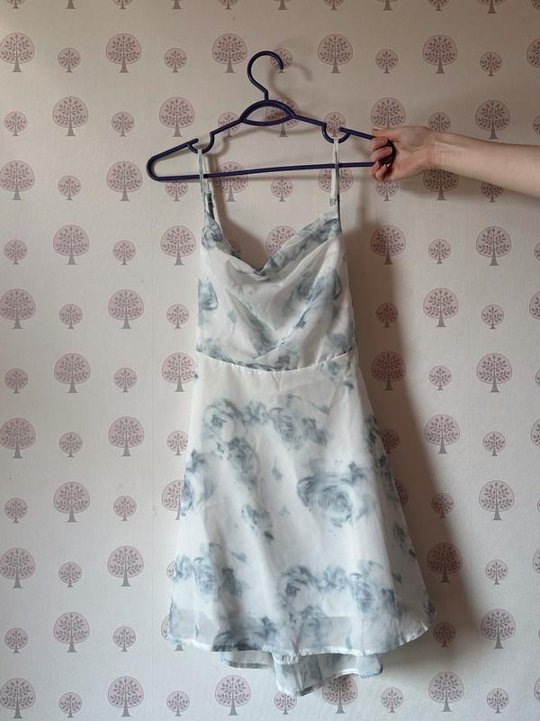 Платье достаточно легкое, выполнено из шифона. Имеет нежные цветочные узоры голубого цвета. Длина платья - 70см без бретелек, до 80см с ними, талия - до 66 см, Зарекомендовали на праздник, одевали только 1 раз. У нас есть 2 таких платья, но на одной маленькое пятно в зоне декольте.