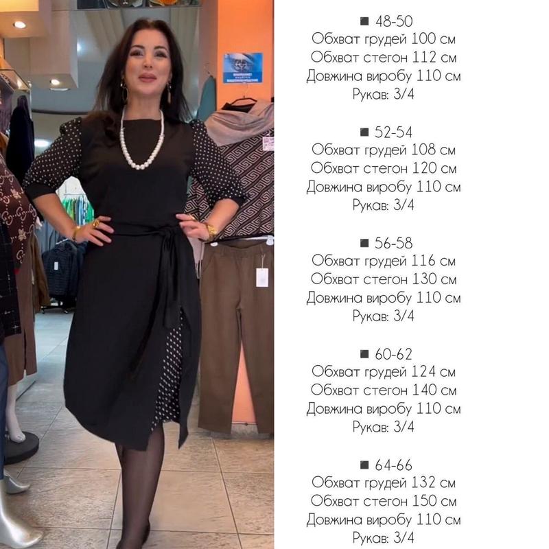 🌷Сукня🌺 Модель: 188 ✅Розмір: 48-50, 52-54, 56-58, 60-62, 64-66 ❤ ⭐️Тканина: шифон+креп дайвінг ✅Колір: чорний Стильна сукня, основа трикотаж креп дайвінг, вставка та рукавчики виготовлені з шифону з ніжним принтом горошки. Тканина тягнеться, рукав 3/4. Сукня підійде як на кожен день, так і на святковий вихід, чудове поєднання комфортності та елегантності. 📎Виміри👇: ✨48-50 Обхват грудей 100 см Обхват стегон 112 см Довжина виробу 110 см Рукав: 3/4 ✨52-54 Обхват грудей 108 см Обхват стегон 120 см Довжина виробу 110 см Рукав: 3/4 ✨56-58 Обхват грудей 116 см Обхват стегон 130 см Довжина виробу 110 см Рукав: 3/4 ✨60-62 Обхват грудей 124 см Обхват стегон 140 см Довжина виробу 110 см Рукав: 3/4 ✨64-66 Обхват грудей 132 см Обхват стегон 150 см Довжина виробу 110 см Рукав: 3/4