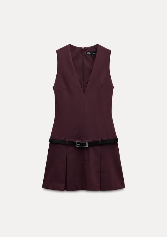 Сукня міні - кольору бургундія (марсала) Сукня з подвійним ремінцем і юбкою в складку ( плісе ) Сукня без рукавів з V - образним декольте, дуже гарно сідає по фігурі Ремінь контрастний, можна змінити на любий інший колір Потайна застібка-молнія по низу