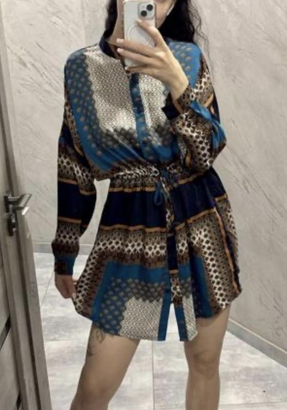 Кольорове плаття з довгими рукавами. , пряме до низу На талії стягується на шнурівку. Рукава спущені. Довжина плаття -88, довжина рукава від плеча -74, ПОТ -62 см