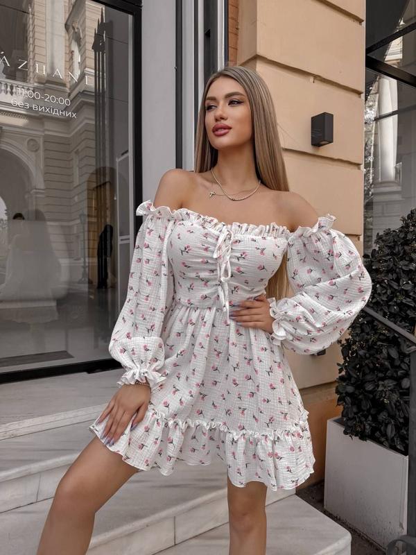 найкрасивіша сукня дуже ніжна та романтична, на груді рюш, декоративна завʼязка; з довгим руковим ліхтарик на резинці, талія на резинці, спинка прострочена; спідниця широка, по низу прилаштована оборка Арт. 10470 Тканина: якісний натуральний принтований "Муслін" , склад 100% бавовна. тканина: Туреччина, дуже приємна на дотик гарна якість тканини та пошіття Кольори: білий (рожева гілочка),білий ( малиновий бутончик), білий (рожевий тюльпанчик) Розмір: с-м(42-44) Об.. гр. до 92 см. Об.талії до 70 см. Довжина 83 см. Розмір: м-л(46-48) Об. гр. до 98 см. Об.талію до 78 см. Довжина 86 см. Ціна 810 грн