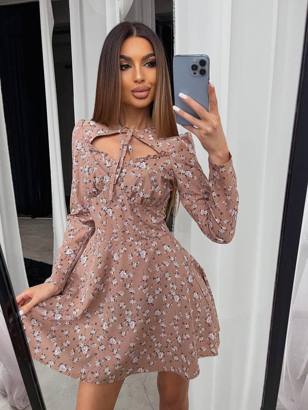 Женское короткое платье с v вырезом на завязках и длинными рукавами приталенное и расширен...