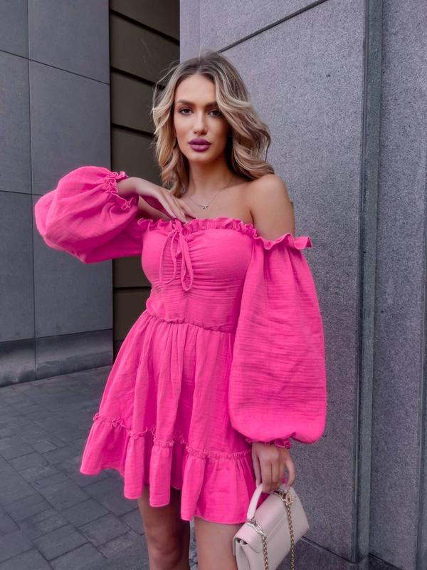 10309 дуже ніжна та романтична, на груді рюш, декоративна завʼязка; з довгим руковим ліхтарик на резинці, талія на резинці, спинка прострочена; спідниця широка, по низу прилаштована оборка Тканина: якісний натуральний "Муслін" , склад 100% бавовна. Кольори: білий, чорний, рожевий, блакитний, малиновий Розмір: с-м(42-44) Об.. гр. до 92 см. Об.талії до 70 см. Довжина 83 см. Розмір: м-л(46-48) Об. гр. до 98 см. Об.талію до 78 см. Довжина 86 см.