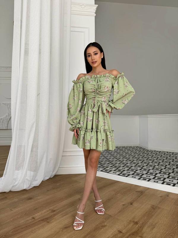 Короткое платье с длинными пышными рукавами и свободной юбкой