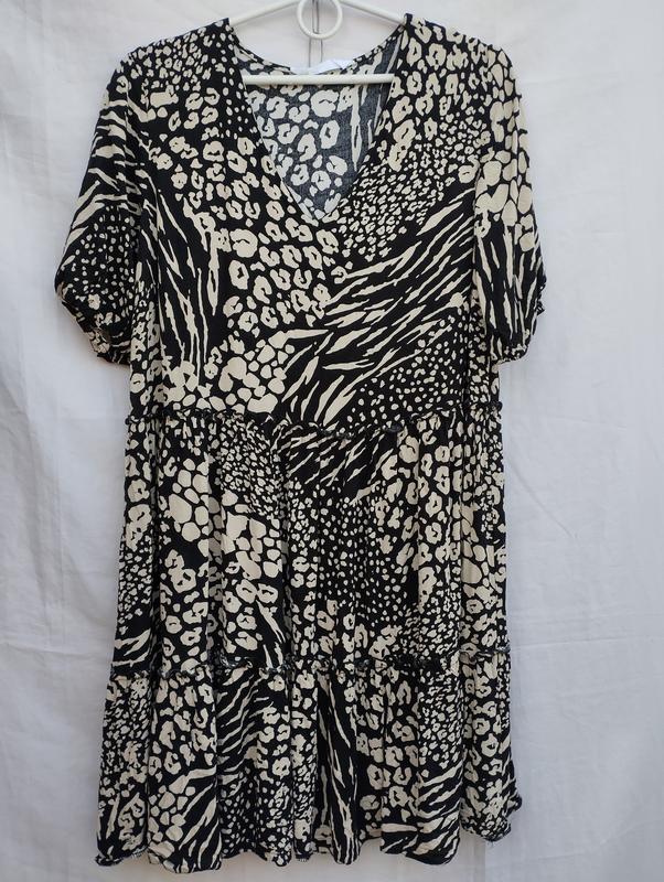 Напів о.г.-54 ширина плечей - 39 довжина рукава - 28 напів о.т.- 56 напів о.с.- 68 довжина - 87 Сукня двох ярусна, молодіжна ,відомого бренду (аналог) ,літня . З натуральної тканини, яка легка , дихаюча та приємна до тіла. Принт - абстракція. Викот V образний. Рукава втачні , короткі ,низ на тонкій резинці. Від плеча до першого ярусу - 41 від першого до другого ярусу - 26 від друго до низу виробу - 20.