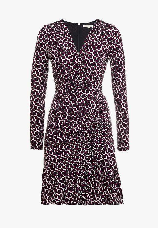 Сукня MICHAEL KORS, модель із круглим вирізом із принтом. Ця коротка червона сукня з чорно-білим графічним принтом має еластичну гумку, яка створює ефект драпірування та обтягує талію. Він має довгі рукави, V-подібний виріз і застібку на блискавку ззаду. Є маленький нюанс на останньому фото