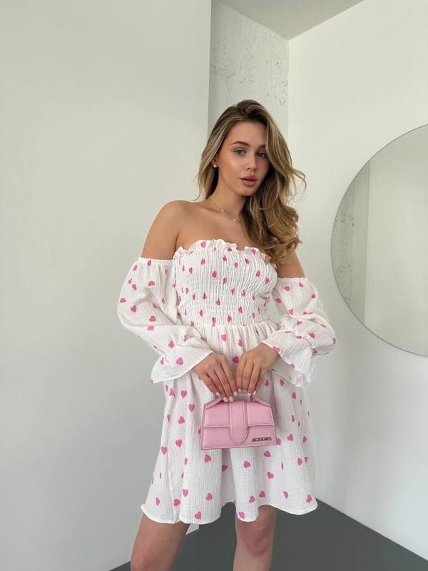Жіноча сукня з мусліну довжина міні з відкритими плечима талія на резинці 42-48 біла