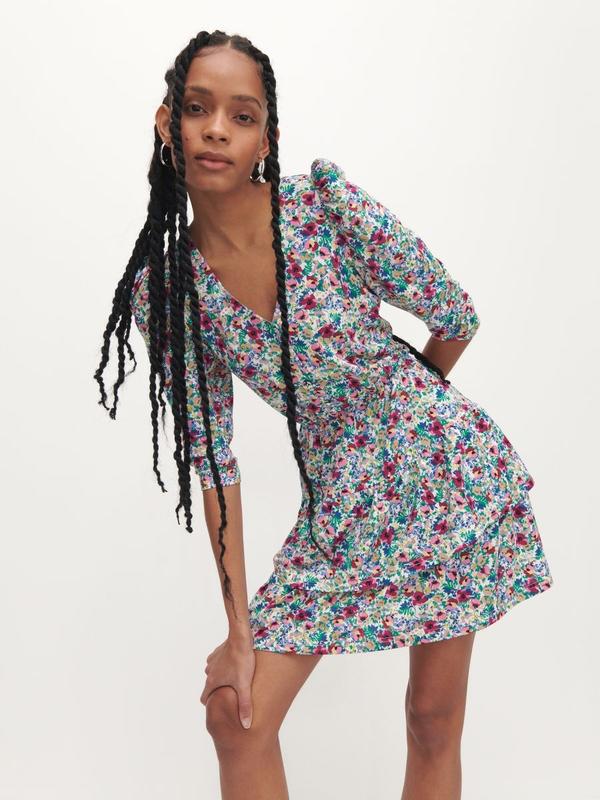 Трендова сукня reserved міні з квітковим принтом Сукня reserved Тканина тягнеться. На поясі є резинка. Заміри: ПОГ- 46 до 56, ПОТ- 34 до 50, ПОБ - 59 до 69. Довжина сукні - 88 см.