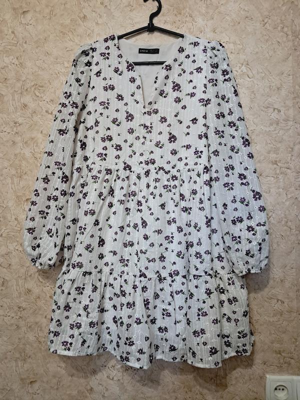 Размер по набору S, за счет фасона подойдет и на М ЗАМІРИ: Полуобъем груди-50 Полуобъем талии-52 Длина -82, длина рукава 60 Ширина плечей-37 Состав: 50% коттон, 50% полиестер Имеет подкладку- не просвечивается