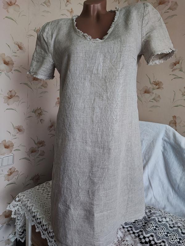 Літнє плаття DELFINO зі 100% льону з блиском. Стильне та комфортне літнє плаття від бренда DELFINO — ідеальний вибір для теплої погоди. Виготовлено з натурального 100% льону з легким благородним блиском, який надає образу вишуканості та підкреслює природну текстуру тканини. Матеріал: 100% льон із делікатним блиском Колір: Світло-сірий/натуральний лляний відтінок Деталі: V-подібний виріз і рукави з необробленими (бахромчастими) краями Довжина: До коліна Посадка: Вільна, не сковує рухів Особливості: Легка, повітропроникна тканина, ідеально підходить для спекотної погоди Плаття чудово поєднується як із сандалями, так і з більш строгими аксесуарами для повсякденного екостилю. Стан нової речі без бирки. Сліди носіння немає. Дефектів немає.