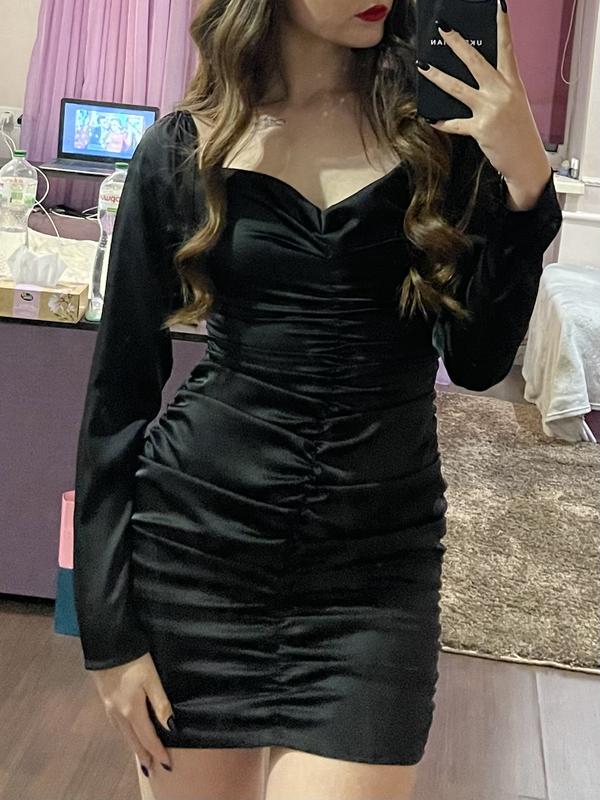 Чорна сукня зі збірками, добре сідає по фігурі, все підкреслює. Тканина легка