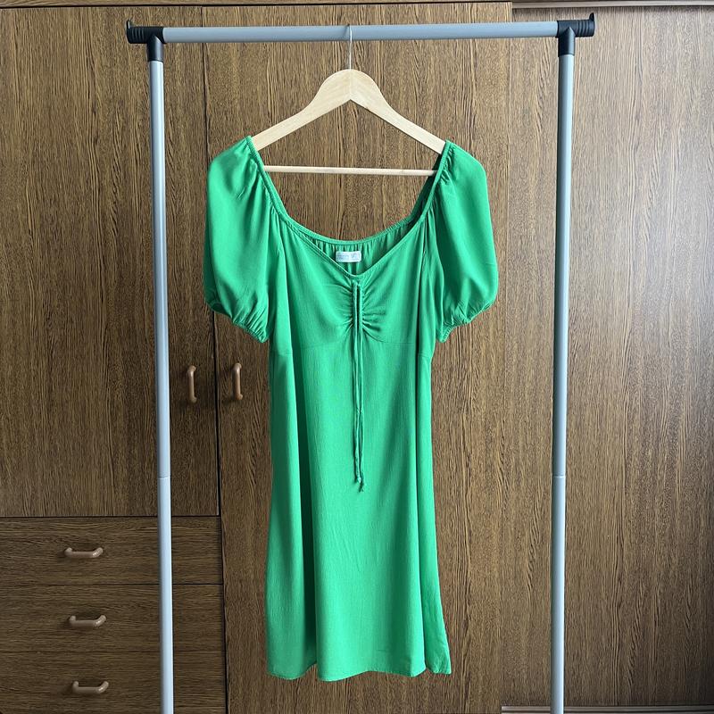 Коротка сукня. Валани на рукавах. Можна спустити на плечі а можна так носити. Шнурок спереду затягується і робить зморшки (зборку). Справжній колір на 7 фото де бірка.