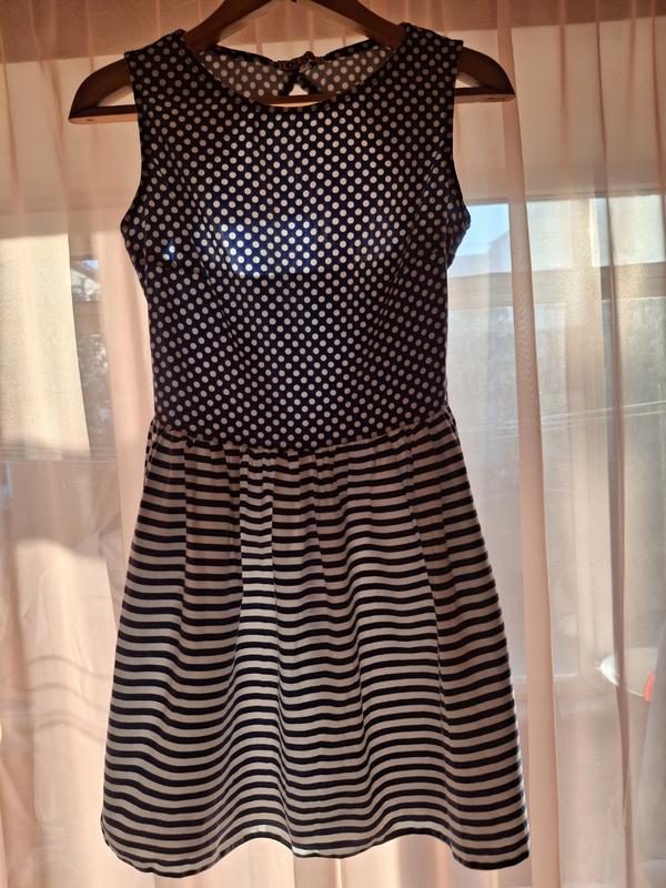 Сукня з бавовни, трохи тягнеться через вміст лайкри. Не просвічує, щільна, але без підкладу. В комплекті з двостороннім поясом. Має приховану застібку збоку та цікавий трикутний виріз на спині. Напівоб'єм грудей 40 Напівоб'єм талії 32 Довжина 80 Можливий огляд/самовивіз з м. Київ, метро Чернігівська, правий берег за домовленістю