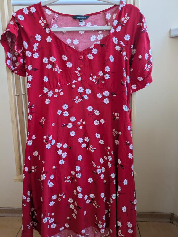 Червона сукня з віскози у білі квіточки Романтичний стиль Розмір S-M Заміри: довжина по центру спинки 85 см, під руками 47 см, по талії 44 см, стегна по 52 см Дуже добрий стан