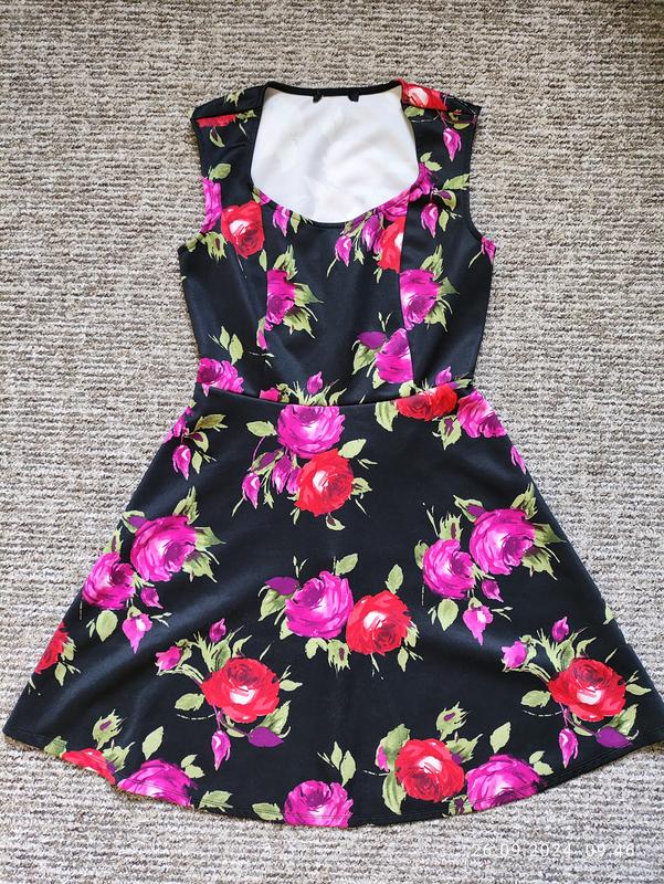 Літня коротка сукня з вирізом на спині. Виготовлена із пілотної тканини. Довжина виробу 84 см. Напівобхват грудей 38 см. Напівобхват талії 32 см. Добре тягнеться.