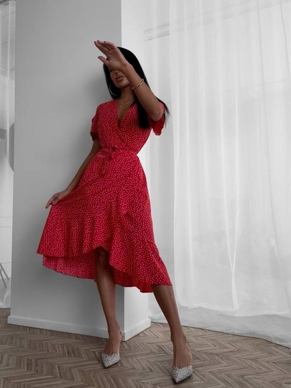 ⬆️Фото реал 📸 Наш власний контент Сукня Модель : 341❤️409 Тканина : супер софт Розмір : універсал Колір : червоний в білий горох,чорний в білий горох,білий в чорний горох Заміри Довжина(центр спинки) - 115 см Довжина рукава - 13 см Плече - 11 см ОГ до 95 Регулюється завʼязкою-поясом Параметри моделі на фото,зріст 165 см ОГ - 80 см ОТ - 63 см ОС - 88 см