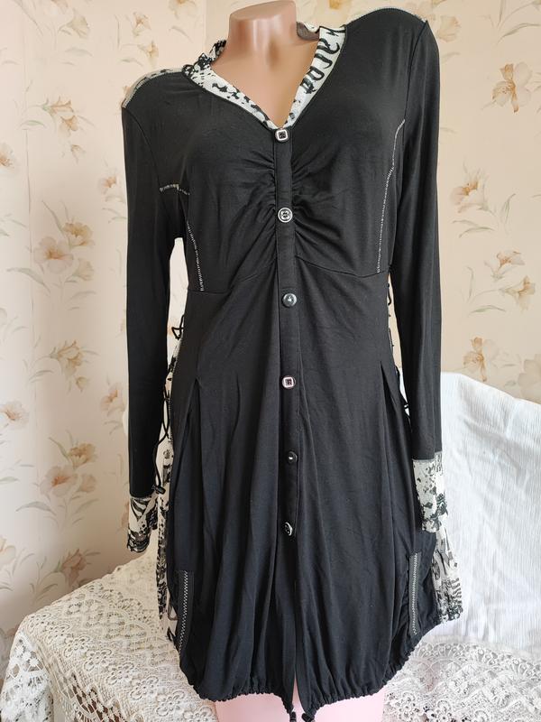 Эффектное брендовое платье мини черного цвета с оригинальными вставками из сеточки контрастного белого цвета с газетным принтом. Спереди на пуговицах-обманках. По бокам можно регулировать по фигуре шнуровкой. Низ также регулируется шнурком. Оригинального кроя, смотрится очень эффектно и стильно. Состояние новой вещи, дефектов нет.