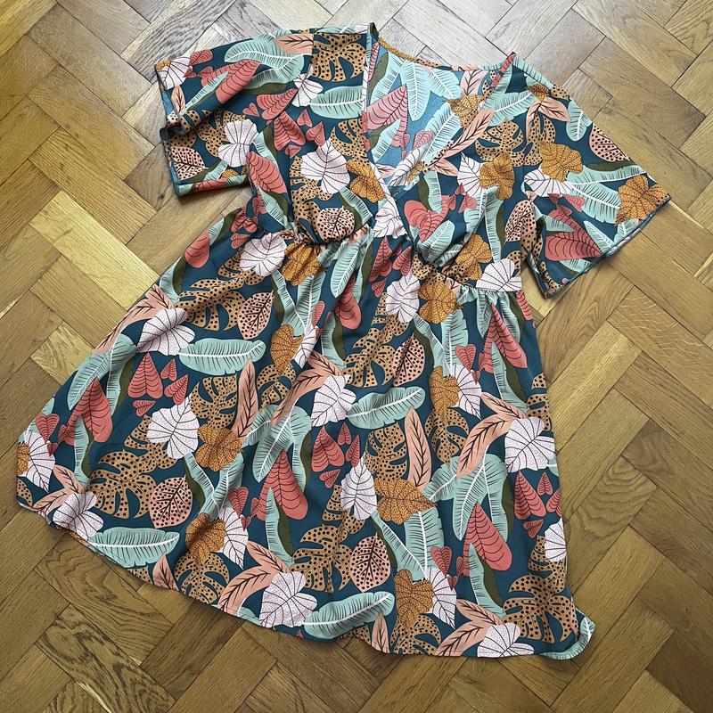 Стан нового ,дуже гарний принт,коротке, Плечі 41 см талія 44 тягнеться до 54,груди 47 довжина 91 см