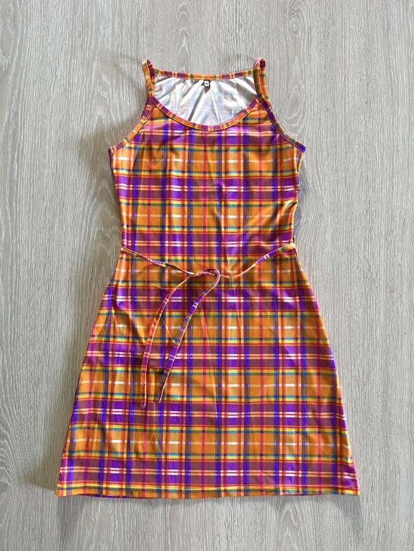 Сукня в клітинку. Розмір з бірки М, іде і на S. Довжина 83 см. Напів обхват грудей 38 см, тягнеться. Напів обхват талії 36 см. Напів обхват стегон 47, тягнеться до 60 см. Поліестер. Стан б/у, сток.