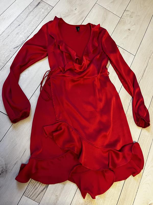 Красива сукня, яскраво насиченого червоного кольору. На запах. Регулюється завʼязками, має рюші. На рукавичках є резинка для зручності.