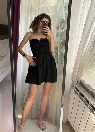 Стан нової. Натуральний склад, 100%,бавовна. Сукня з підкладкою, тому створює ефект трохи пишної і повітряної. Тоненькі бретелі, регулюються. Верх як драпіровка з резинкою, вздовж всієї сукні ґудзики, які також функціональні. Низ сукні не оброблений. По бірці розмір М, рекомендую на S. Заміри: Довжина без бретелей 70 см З бретелею орієнтовно 90-91 см Пів обхват груди 38 см Пів обхват талії 38 см Але це все резинка, яка тягнеться, заміри зроблені в спокійному стані.