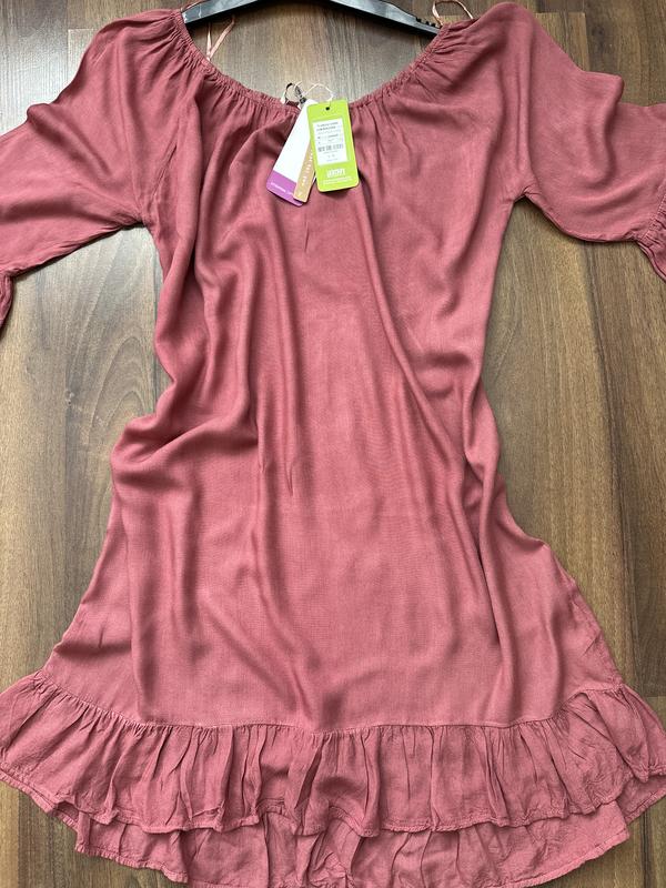 Дуже гарне тоненьке платтячко, розмір м-л вільний фасон, дуже гарний малиновий колір, зона декольте вся на резинці, перед плаття на пару см коротший видно на фото