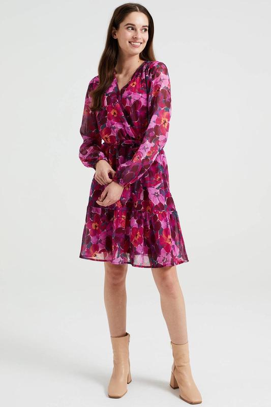 Шифонова квіткова сукня на запах на резинці з поясом на підкладці. Тканина приємна до тіла, не просвічується та не тягнеться. Напівобʼєм грудей: 57 см, напівобʼєм талії: 44 см (тягнеться до 52 см), напівобʼєм стегон: 63 см, плечі: 41 см, довжина рукава від плеча: 60 см, довжина сукні по спинці: 99 см.