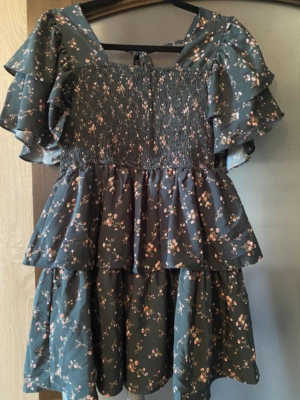 Сукня коротенька, темно-зеленого кольору в дрібну квітку. На плечах лягає валанами, спідниця обʼємна. На діру розмір С але підійде і на Л за рахунок резинки на грудях. Підходить на не високий зріст до 165 см. Ог до 115 От до 97 ОБ вільно