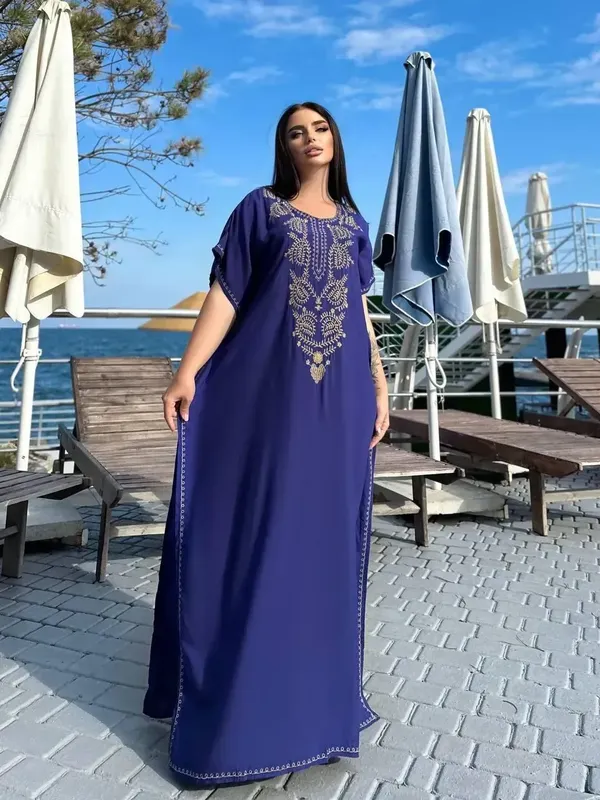 Створи свій королівський образ на відпочинку! SW656 Благородна сукня-кафтан у кольорі глибокого індиго з розкішною вишивкою ідеально підходить для дівчат PLUS SIZE Це не просто одяг - це відчуття свободи, впевненості та шарму Ідеальний фасон oversize - красиво лягає на фігуру, маскує животик і стегна Повітряна натуральна тканина віскоза , що не парить, ідеально підходить для спеки й подорожей Вишивка додає східного шарму Сукня підходить для розмірів від XL до 5XL (груди /стегна 110-145 см) Швидка доставка по Україні та за кордон