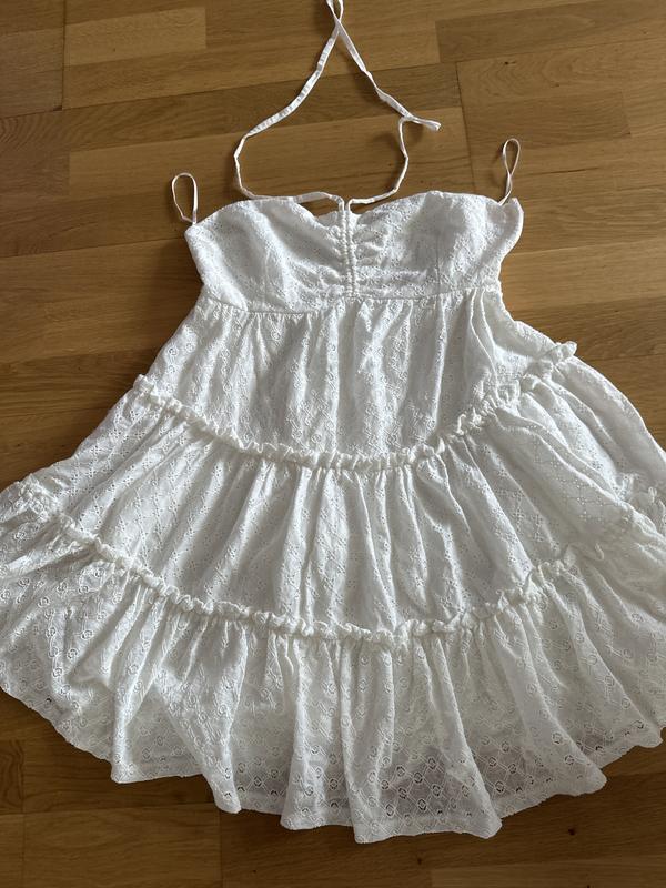 Стан ідеальний Збоку застібається на змійку. Зіскочив бігунок,все інше-супер. Натуральна тканина-прошва Підклад-поліестер Довж-65/від грудей/ НОГ -40/45см.Лііф з виточками. Нот-38/40 Ширина спинки-39/40см Низ-вільно Фіксується на шиї завʼязками