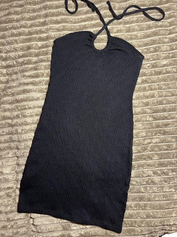Сукня з оригінальним вирізом халтер (зав'язки на шиї), що відкриває спину та підкреслює плечі. Облягаючий крій, довжина міні . Фактурна тканина, що імітує дуже дрібну в'язку або сіточку, створюючи ефект напівпрозорості. Це робить сукню легкою, повітряною та ідеальною для пляжних образів або як елемент багатошарового вбрання. Бренд H&M. Стан Б/у, ідеальний стан – без дефектів, виглядає як нова. Розмір S.