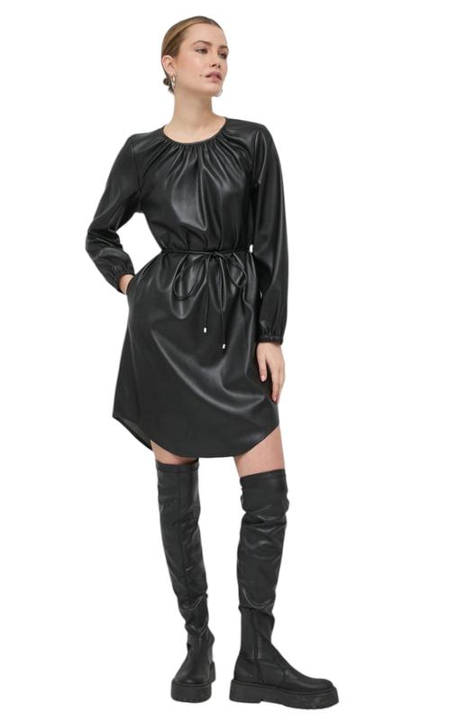 Платье из коллекции BOSS. прямое модель выполнена из имитации кожи. - Прямой фасон. - Длинный рукав. - Рукава со стяжкой. - Завязка на талии. - Круглый вырез. - Застегивается на пуговицу. - Длина рукава: см. - Длина: см. - Ширина под подмышками: см. -Пояс не родной . Подбор . Можно носить без пояса