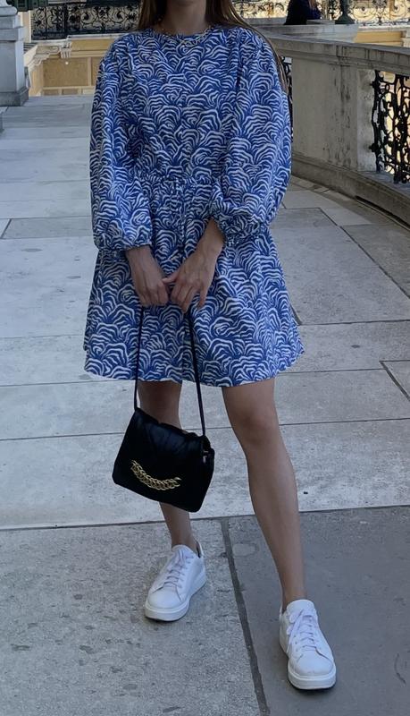 Сукня до коліна, на прихованих ґудзиках та затягується на талії. На рукавах має резинку, що допомагає краще тримати форму. Матеріал: льон