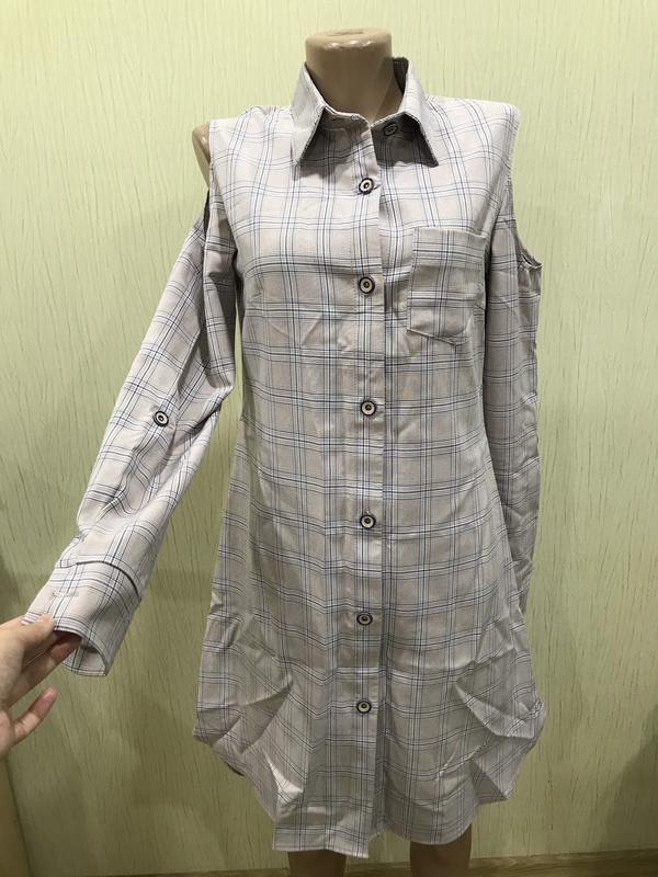 Плаття в клітку з вирізаними плічкам, розмір M Матеріал: 65% поліестер, 35% бавовна. Довжина — 92 см, грудей — 48 см, талії — 45 см, стегон — 53 см, довжина рукава — 65 см. Стан: ідеальний. За деталями пишіть у особисті повідомлення