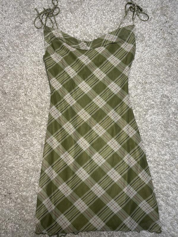 • Колір: оливковий із біло-червоним картатим принтом • Фасон: приталений силует, довжина міні (вище коліна) • Верх: тонкі бретелі на зав’язках, драпіровка на грудях • Матеріал: 100% поліестер, легкий і приємний до тіла • Сезон: весна/літо • Стан: дуже добрий, без дефектів